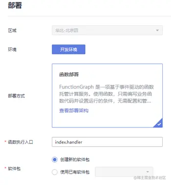 8.单击红色“部署”按钮,此时可进入部署设置页面,编辑函数执行入口、选择软件包,此案例中,我们选择“创建新的软件包”,如下图所示。