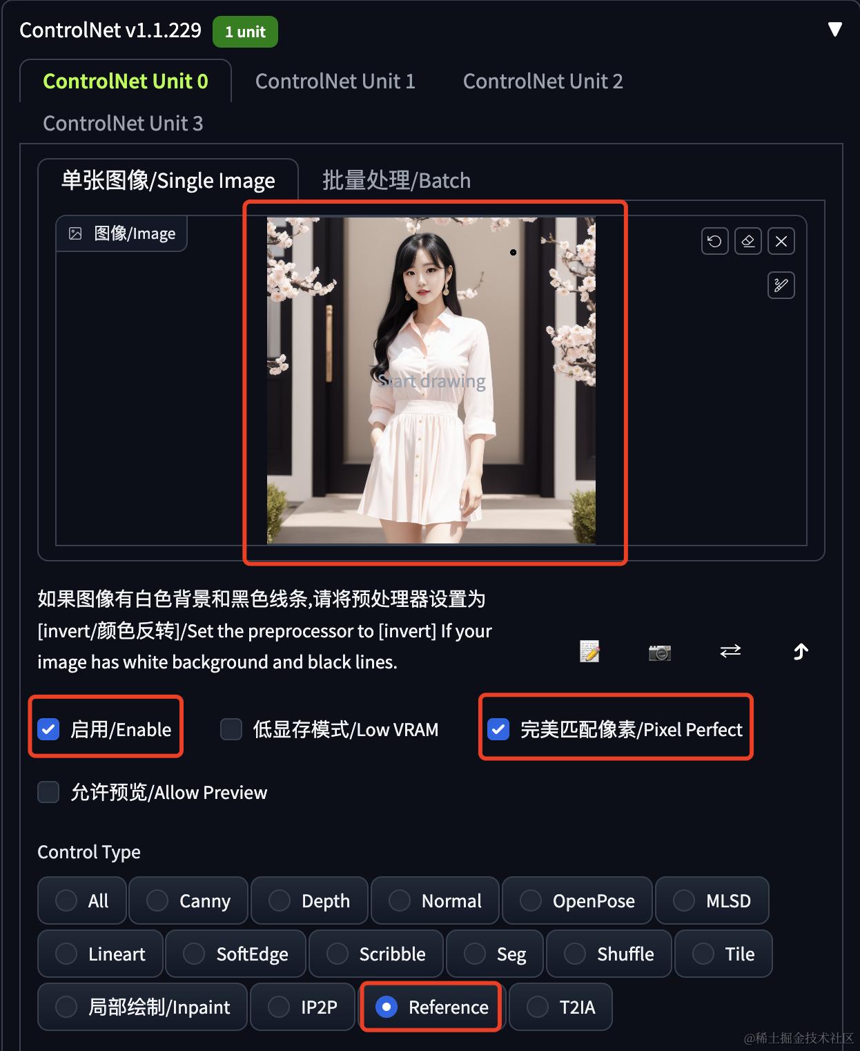 最最重要的就是 ControlNet 的设置,如下图所示: