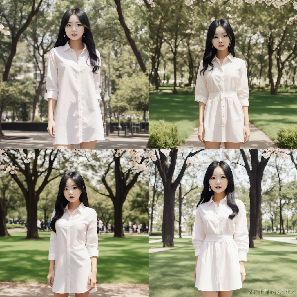 把背景换成公园:1girl, white shirt and dress, ((the background is park))。背景更换成功,同时人物姿态和衣服颜色都没啥大变化。