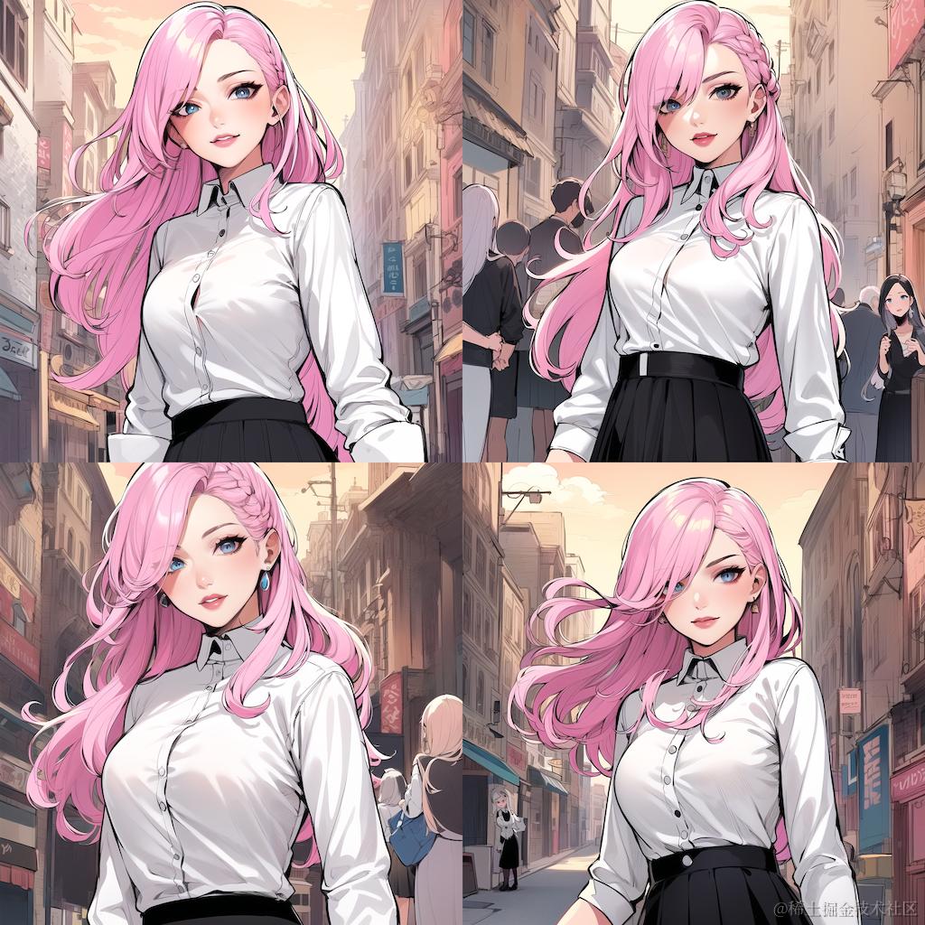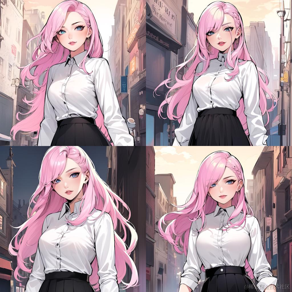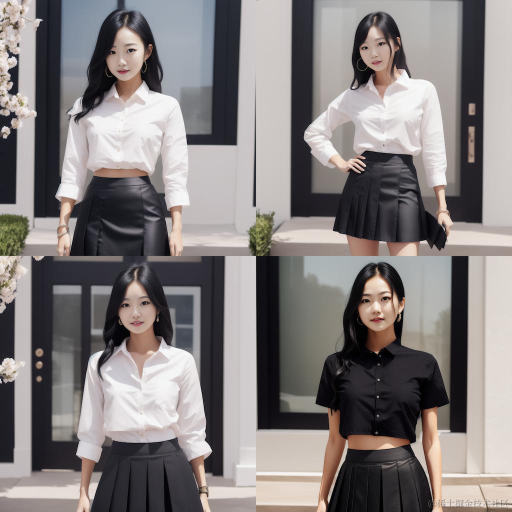 裙子变成黑色:1girl, white shirt, ((black skirt)),提示词权重要高一些,否则不容易扭转过来。人物姿态和背景都没啥大变化,裙子也变成了黑色,只是有一张用力过猛,上衣颜色也变了。