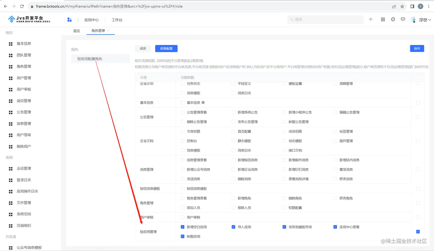 在有了这个管理员后,可以在租户里创建组织,创建角色,分配权限,其中针对轻应用有相关权限控制: