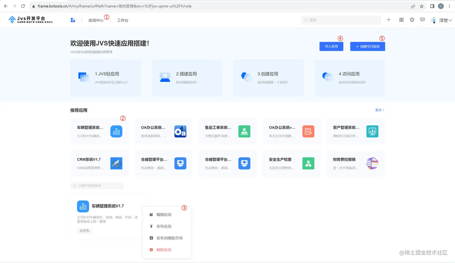 ③:在已经安装的应用,点击“...”省略按钮,系统弹出对应用的操作菜单,包括编辑、发布、发布到模板中心、删除等操作