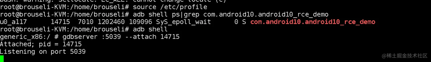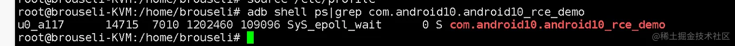 adb shell ps|grep com.android10.android10_rce_demo ## grep 后面接的是apk 应用的完整包名