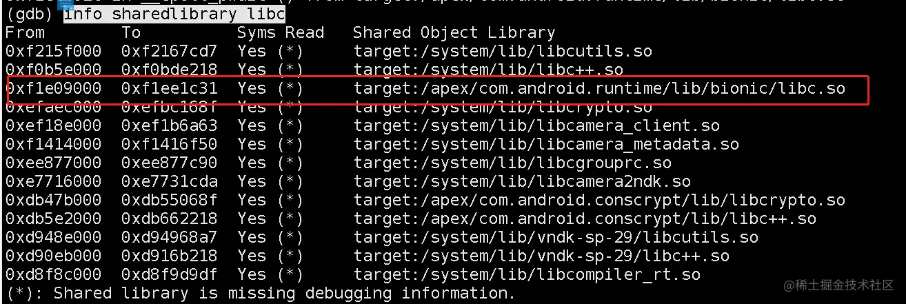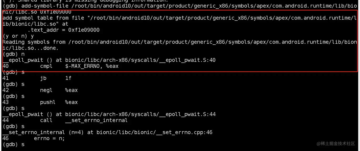 add-symbol-file /root/bin/android10/out/target/product/generic_x86/symbols/apex/com.android.runtime/lib/bionic/libc.so 0xf1e09000 ##引入符号表