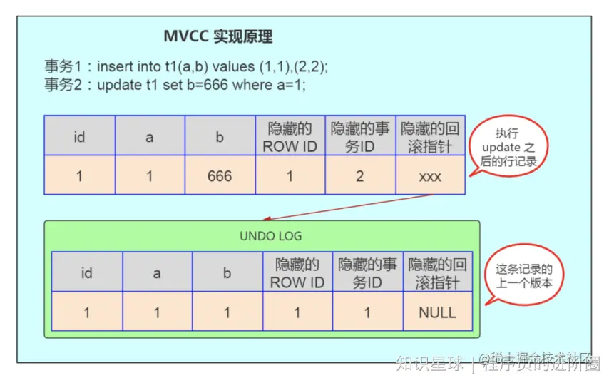 InnoDB 每一行数据都有一个隐藏的回滚指针,用于指向该行修改前的最后一个历史版本,这个历史版本存放在 undo log 中。如果要执行更新操作,会将原记录放入 undo log 中,并通过隐藏的回滚指针指向undo log 中的原记录。其它事务此时需要查询时,就是查询 undo log 中这行数据的最后一个历史版本。