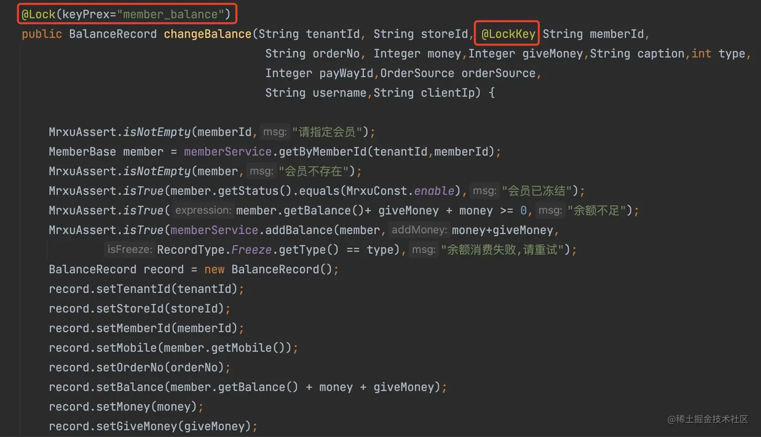 举例,我们有这样一个方法: 会员余额变更,为了防止多实例并发情况下余额错乱问题,在做会员余额变更时 我们需要对当前会员加锁。加锁时我们只用在方法上加自定义的lock注解 ,在方法参数中加lockkey注解。根据业务我们这里是需要对当前会员加锁,所以我们在memberid上加lockkey注解,加上这两个注解后,加锁就完成了。