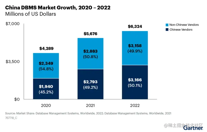 数据显示,2022年中国 DBMS 市场规模增长至63.24亿美元,较2021年同比增长了11.4% 。2022年,中国供应商的市场份额增至50.1% ,首次超过50%。