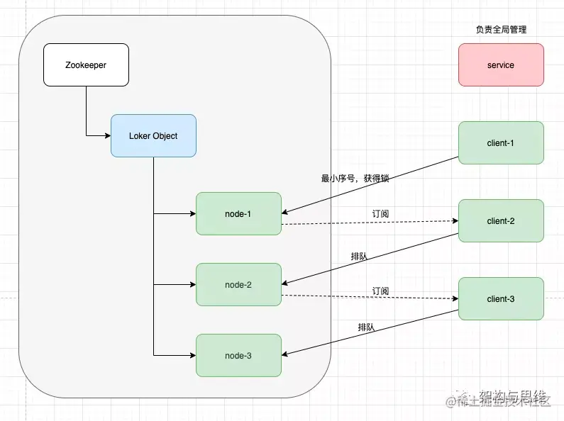 Locker Object 是对需要竞争的资源进行持久的节点,下面的node-1到node-n 就是上面说的有序子节点,由不同进程的client去创建。