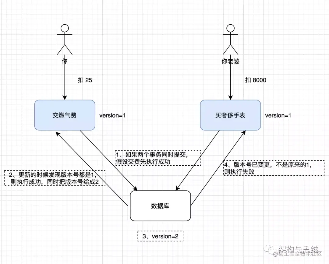 但是如果使用乐观锁机制,当两个请求同时到达的时候,需要获取到账号信息包括版本号信息,不管是A操作(支付燃气费)还是B操作(购买手表),都会将版本号加1,即version=2,