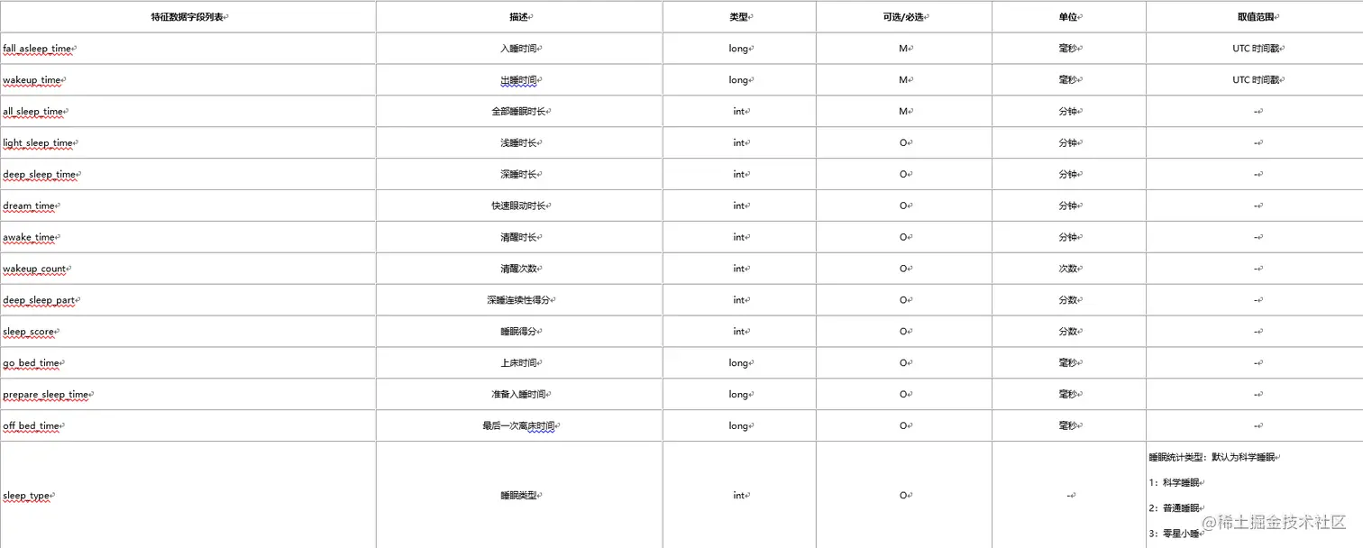 Health Kit提供睡眠记录数据权限,记录用户从入睡到出睡的一段完整睡眠记录,包括睡眠特征统计数据以及每个时刻的睡眠状态采样数据,其中包含入睡/出睡时间、睡眠分期数据、离床时间、觉醒次数/时长等睡眠记录数据。经用户同意后,通过读取用户相关睡眠数据情况,开发者可以计算睡眠效率、分析用户睡眠质量,为用户提供相应的睡眠分析服务。