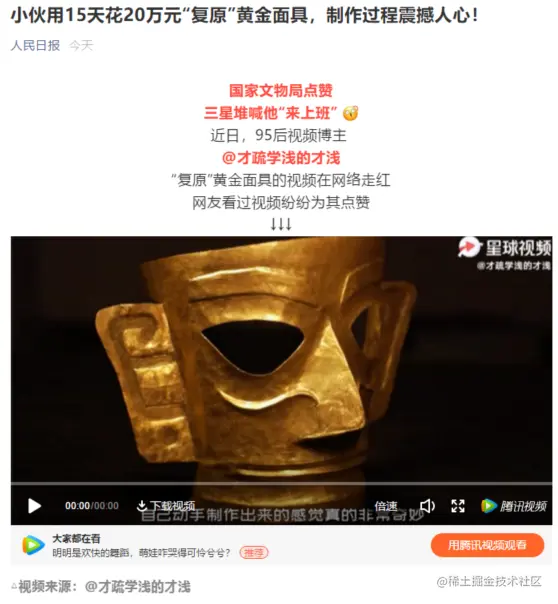 我在前面提到了一个 UP 主叫做“才疏学浅的才浅”,在 2021 年的时候,他因为制作“黄金面具”而被各大官媒点名表扬,各路群众看了他的视频之后也是纷纷竖起了大拇指。