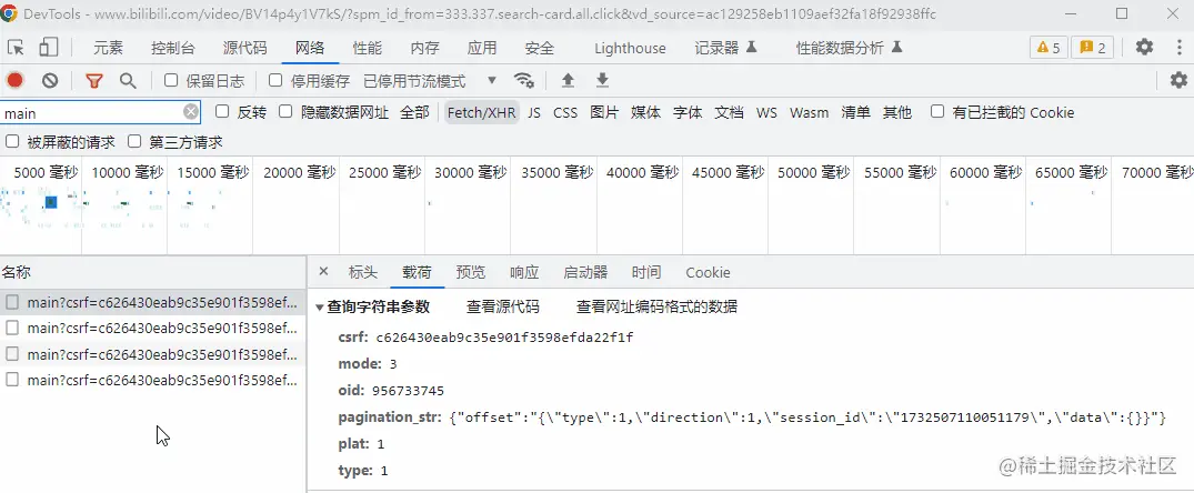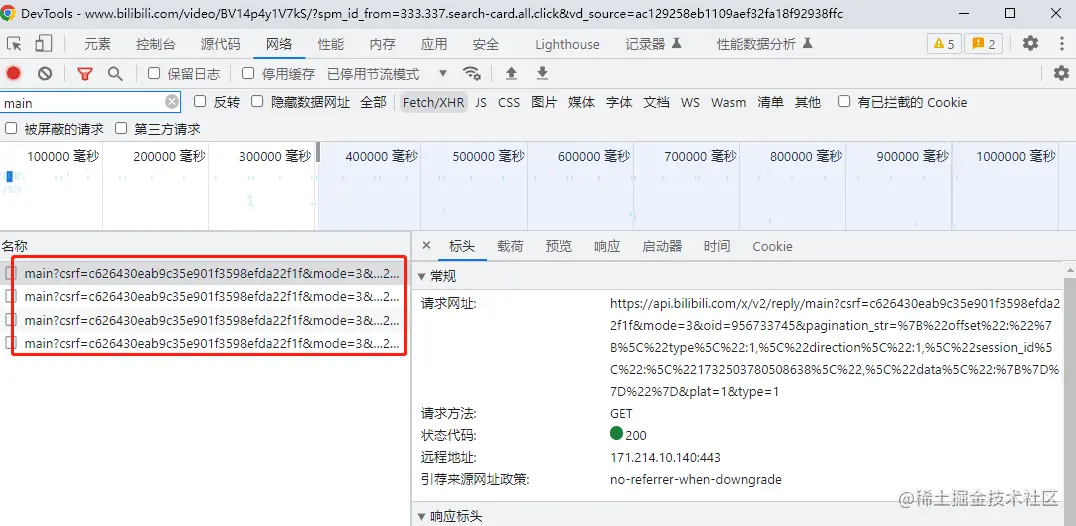 在 B 站的接口里面,我没有看到这样的相关信息,我能看到的是每次请求都一模一样。