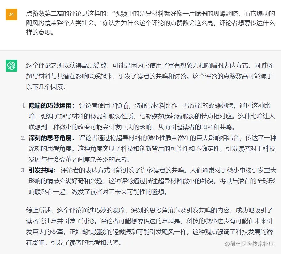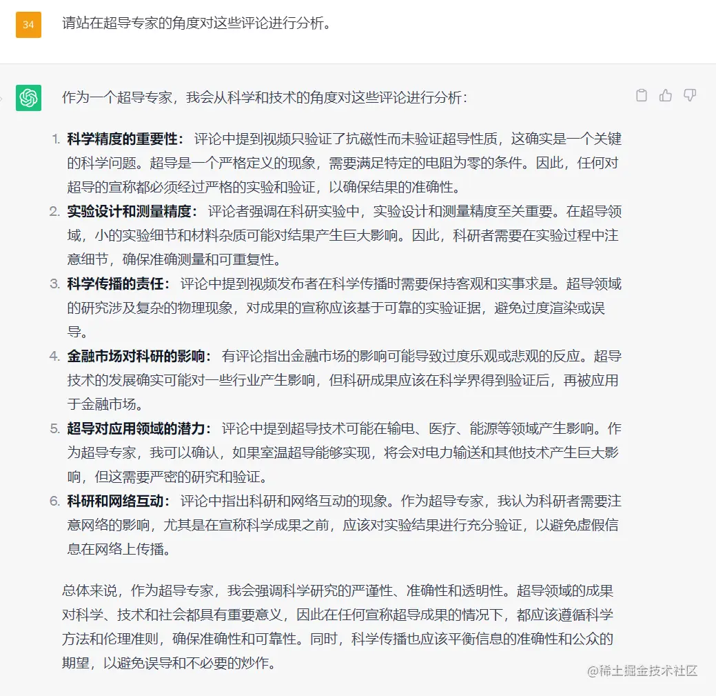 于是,我又让它站在“超导专家”的角度对这些评论进行了分析,回复的内容也还说的过去: