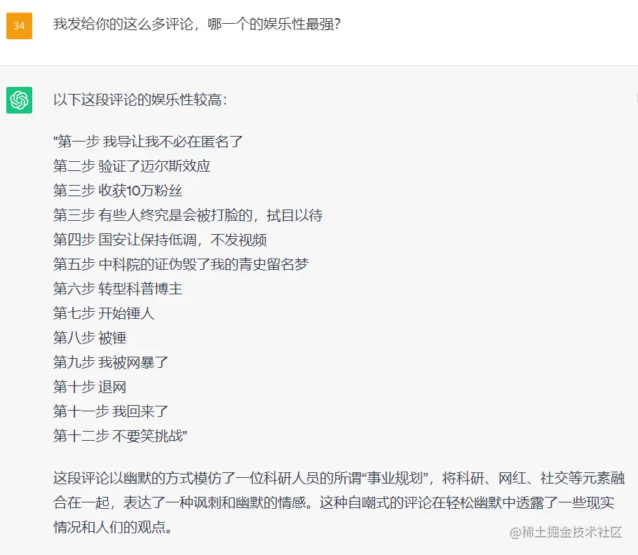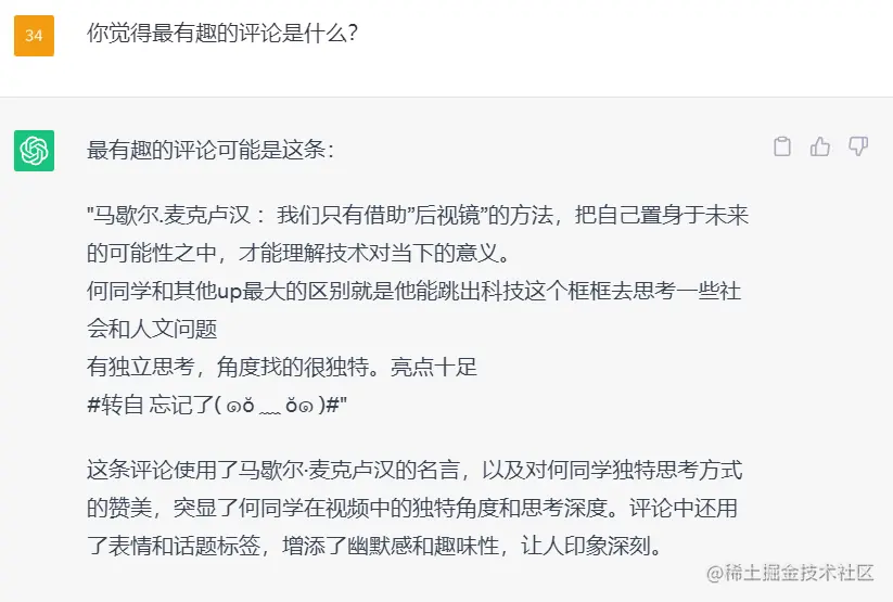 同样的,我把评论区喂给了 ChatGPT,让它选出了最有意思的一条评论: