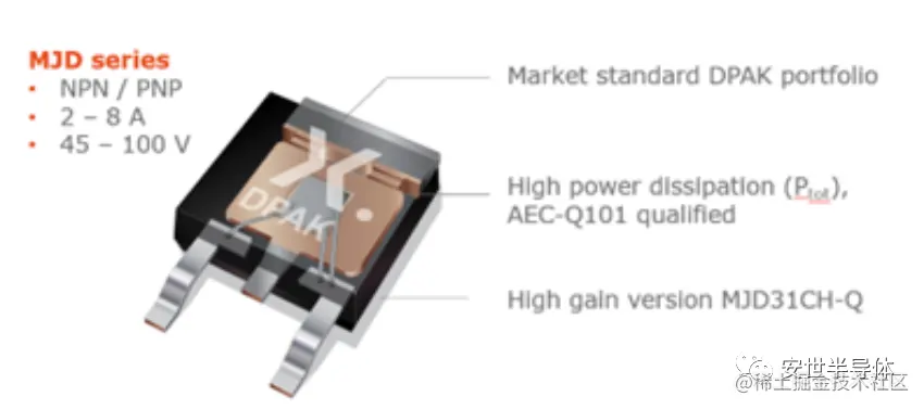 Nexperia(安世半导体)的 MJD 系列功率双极性晶体管采用 DPAK 封装,具有出色的热功耗,非常适合此应用。该解决方案使用两个符合汽车标准的 MJD31C 大功率 100 V 3 A NPN 双极晶体管,但对于需要更精密线性稳压器的应用,则可用增益更高的 MJD31CH-Q 替代 MJD31CA。