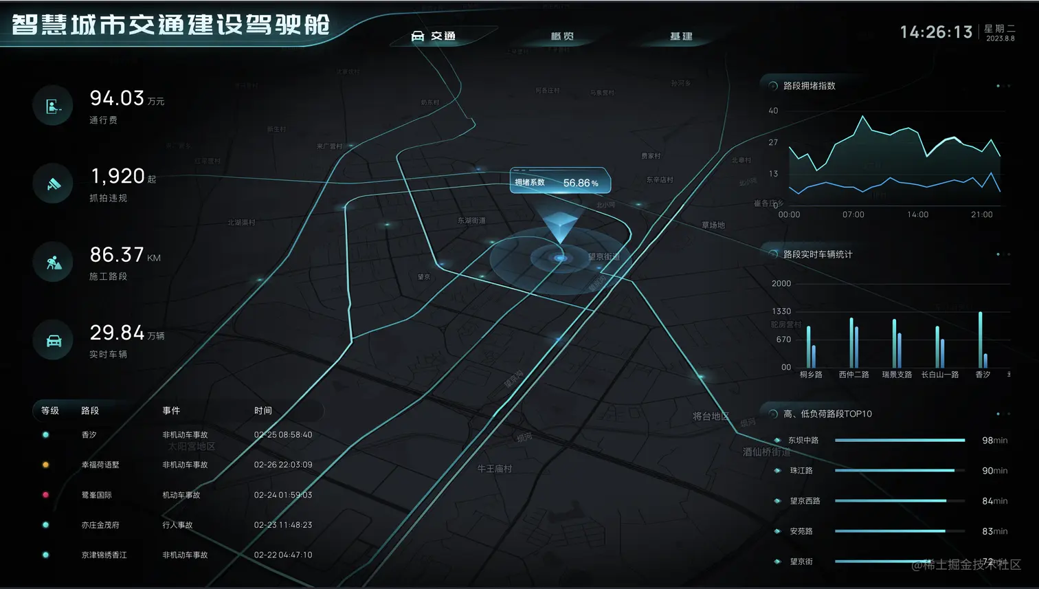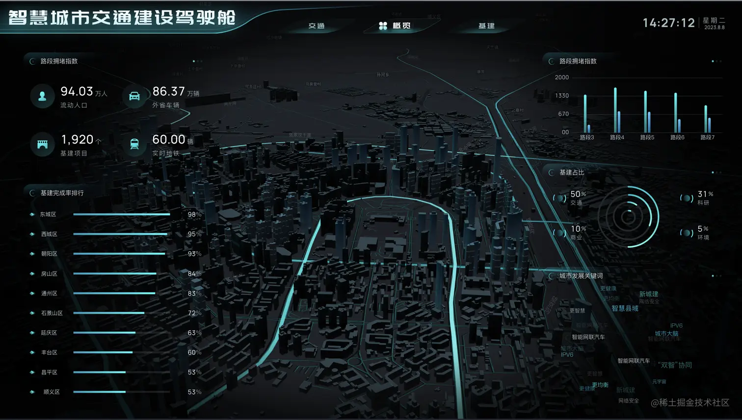 智慧城市交通建设可视化对于交通管理和决策提供了强有力的支持。通过可视化展示,交通管理部门能够全面了解城市交通系统的状况和运行特征,依据城市发展关键词、东城区等各地基建完成率、总体路段拥堵指数等指标,及时采取相应的管理措施。决策者也可以制定科学合理的交通政策和规划,以提高城市交通系统的运行效率和服务质量。