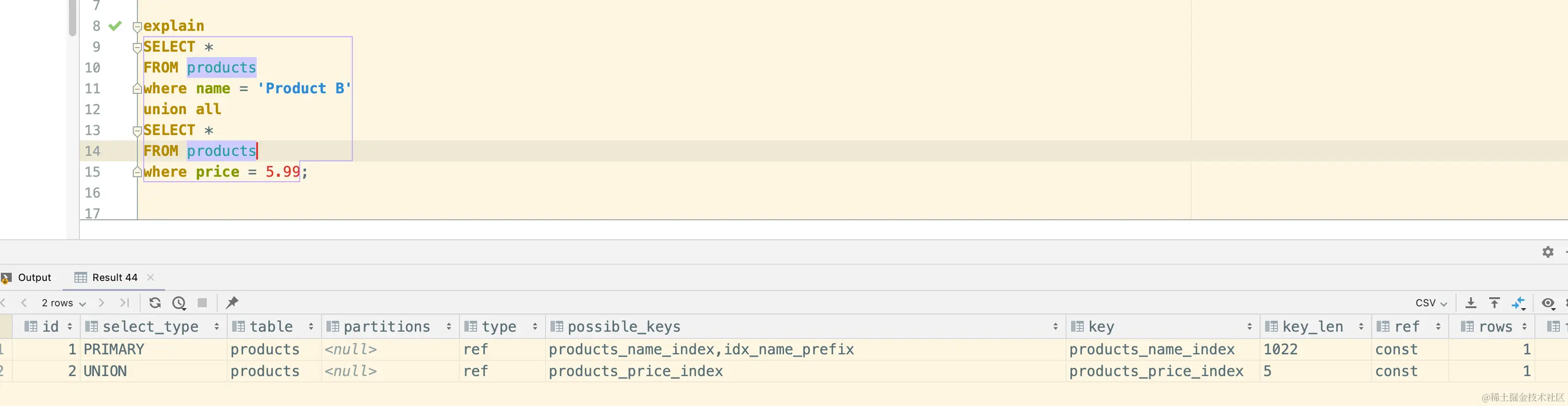 - 结果集顺序:UNION会在最终结果集进行排序,UNION ALL不会进行排序,结果集顺序由各个子查询顺序决定