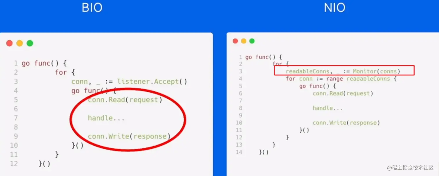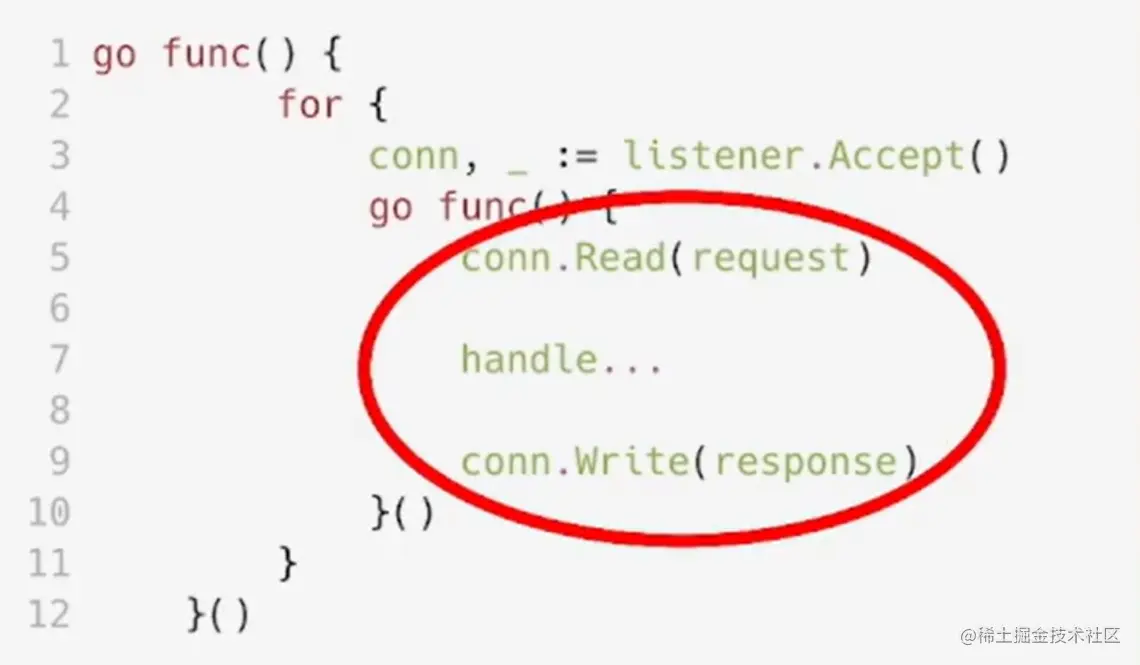 在go func(){}中维护一个 listener。每次Accept()了一个连接之后,会单独开一个协程去处理。先读数据,再处理业务逻辑,再把response写回。在读数据的期间如果数据量不够,应用会阻塞,别的什么也干不了。