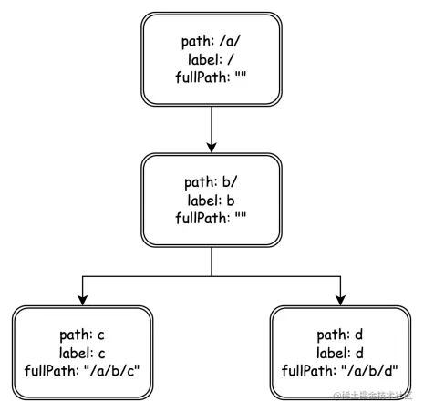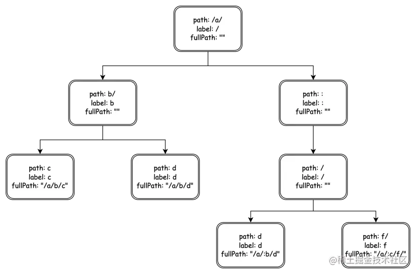 map[string]handlers。但map只对静态路由有效,无法实现参数路由。优点是快且简单。 - 更好的方式是采用前缀匹配树。假设来了一个请求的url是/a/b/c,根据以下的前缀匹配树,会先匹配上/a/,然后匹配b/,最后匹配c。都匹配上之后,再将当前处理函数返回给下一层,让下一层执行。