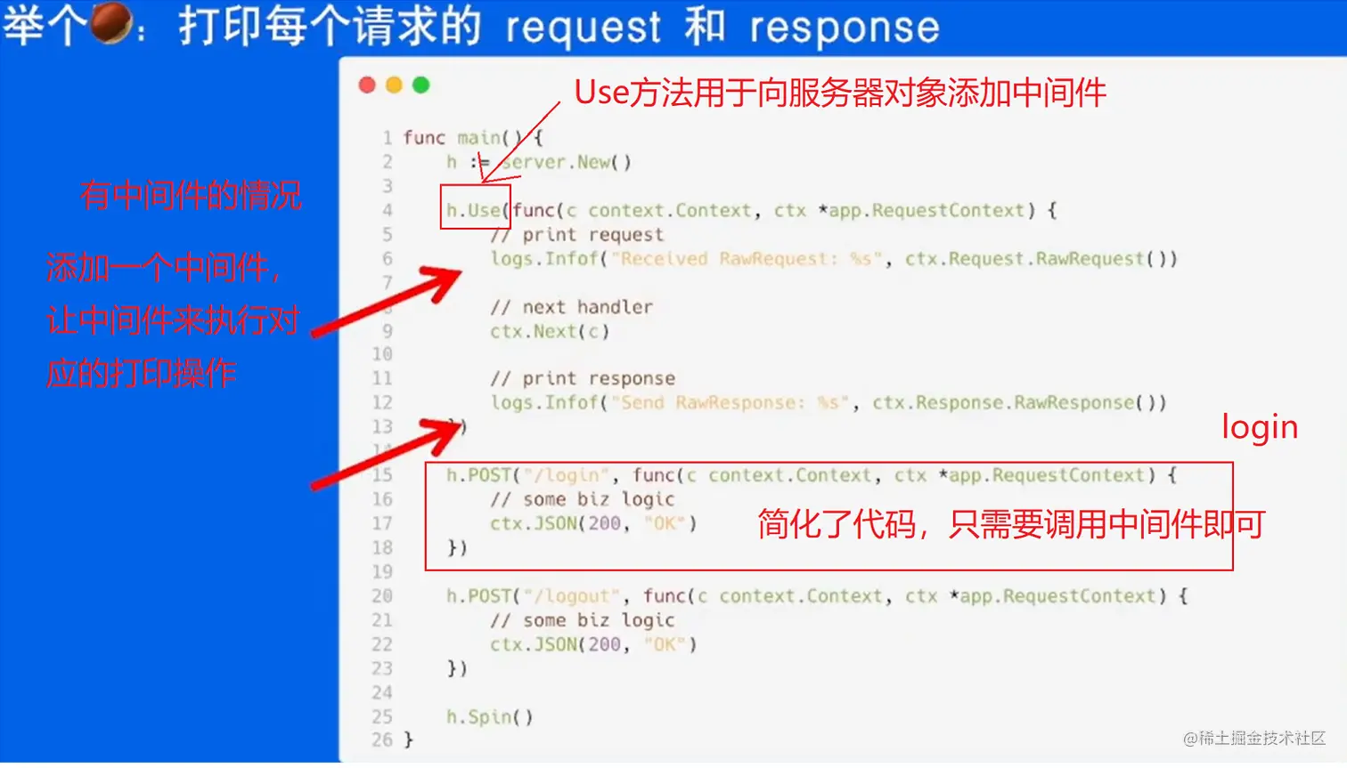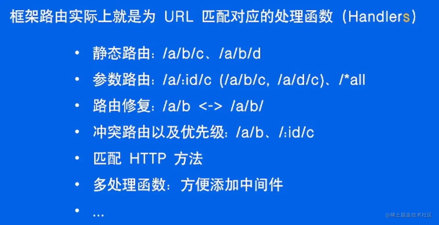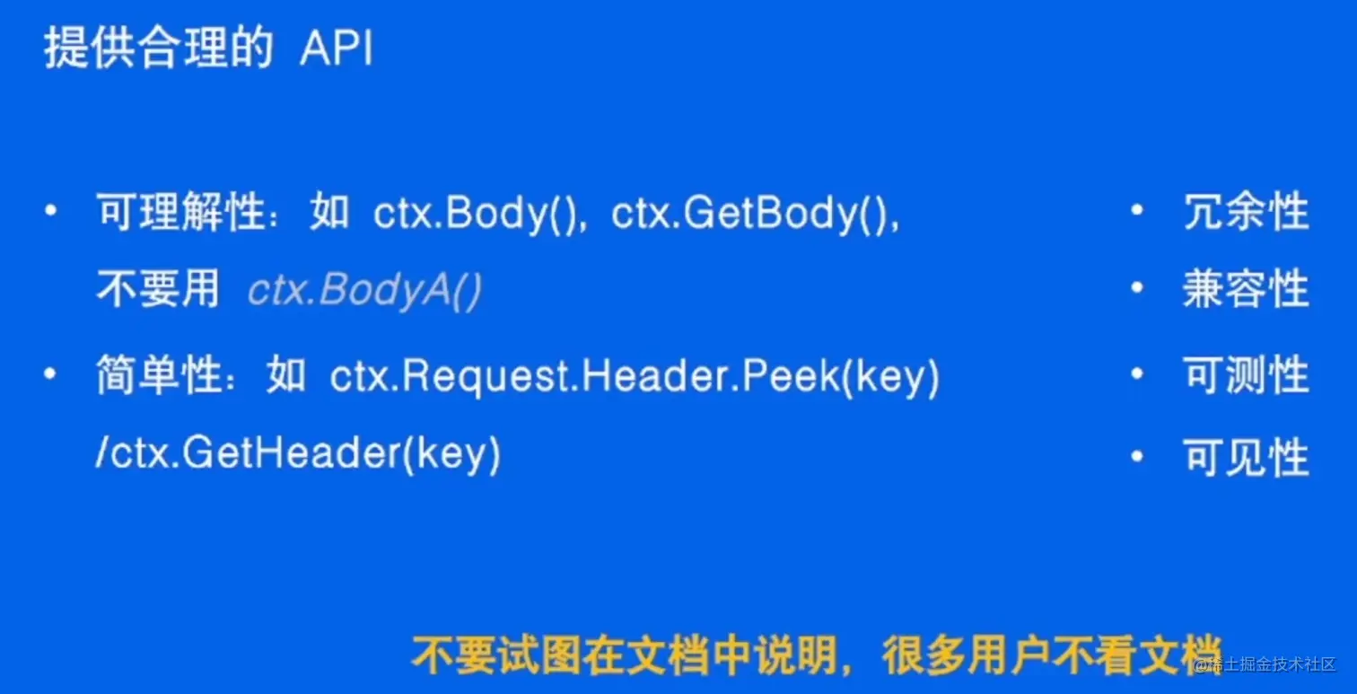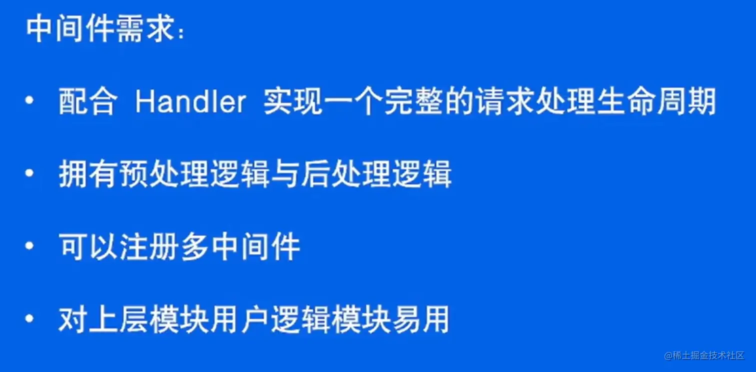 - 路由上可以注册多个中间件,同时也可以满足请求级别有效,只需要将中间件设计为和业务和 Handler 相同即可。即把调用业务的接口和调用其它中间件的接口统一命名;