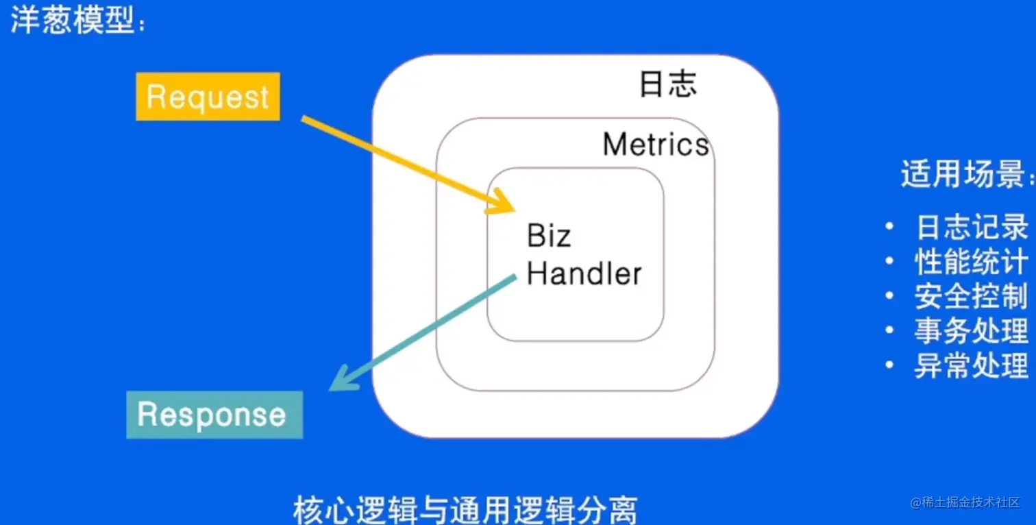当有请求request时,首先经过日志中间件的预处理,然后经过Metrics中间件的预处理,最后再执行业务逻辑;在业务逻辑退出之后,还会有后处理,首先经过Metrics的后处理,最后经过日志中间件的后处理,然后再将真正的响应response返回给用户。