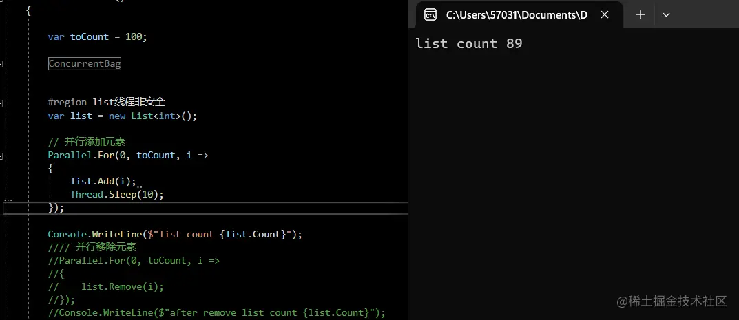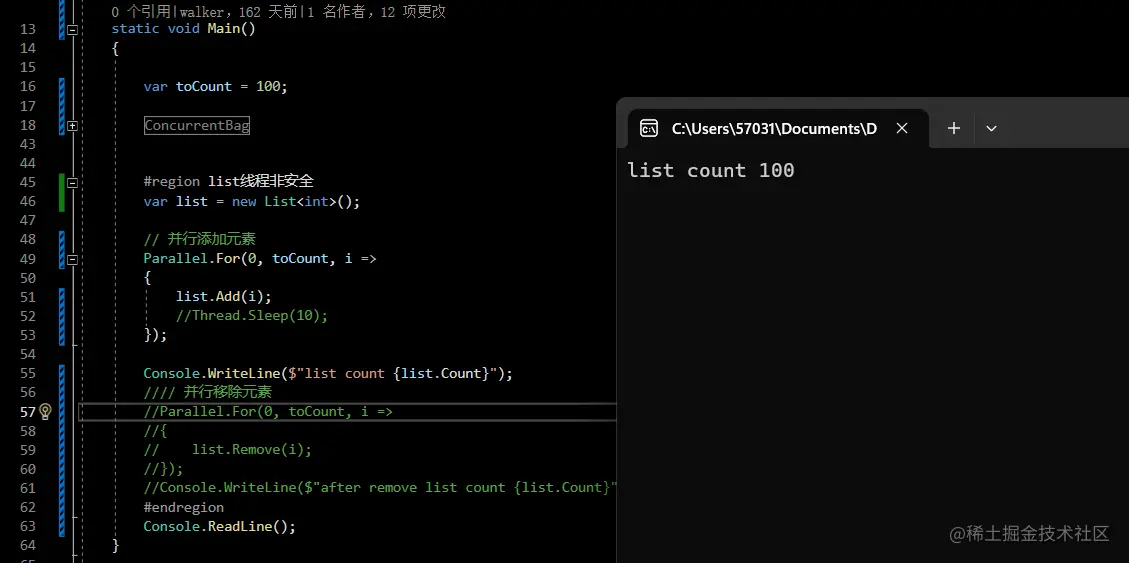 使用 **Parallel.For ** 来并发添加元素,执行数次之后发现输出的都为100,看起来似乎没有什么问题。