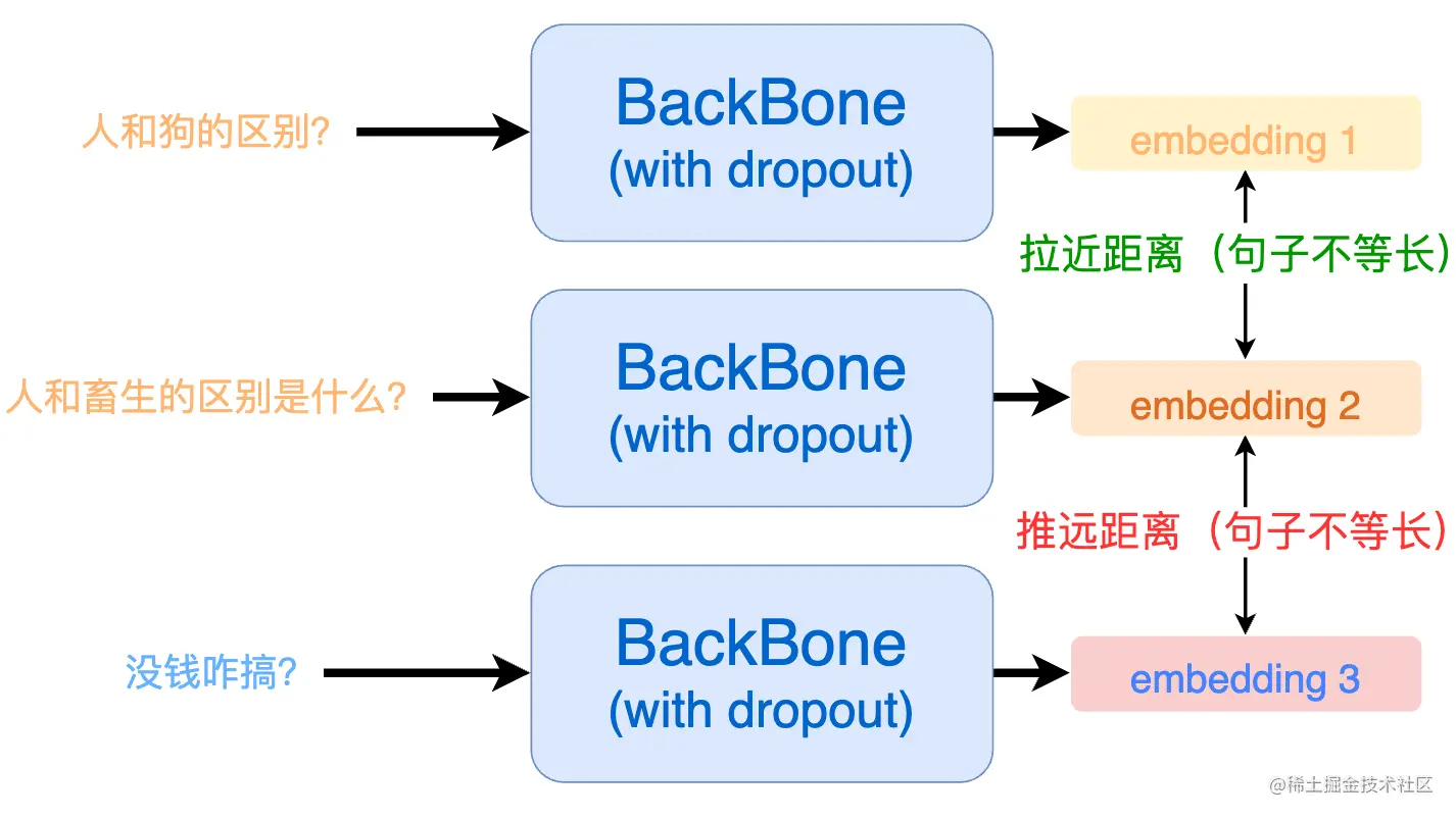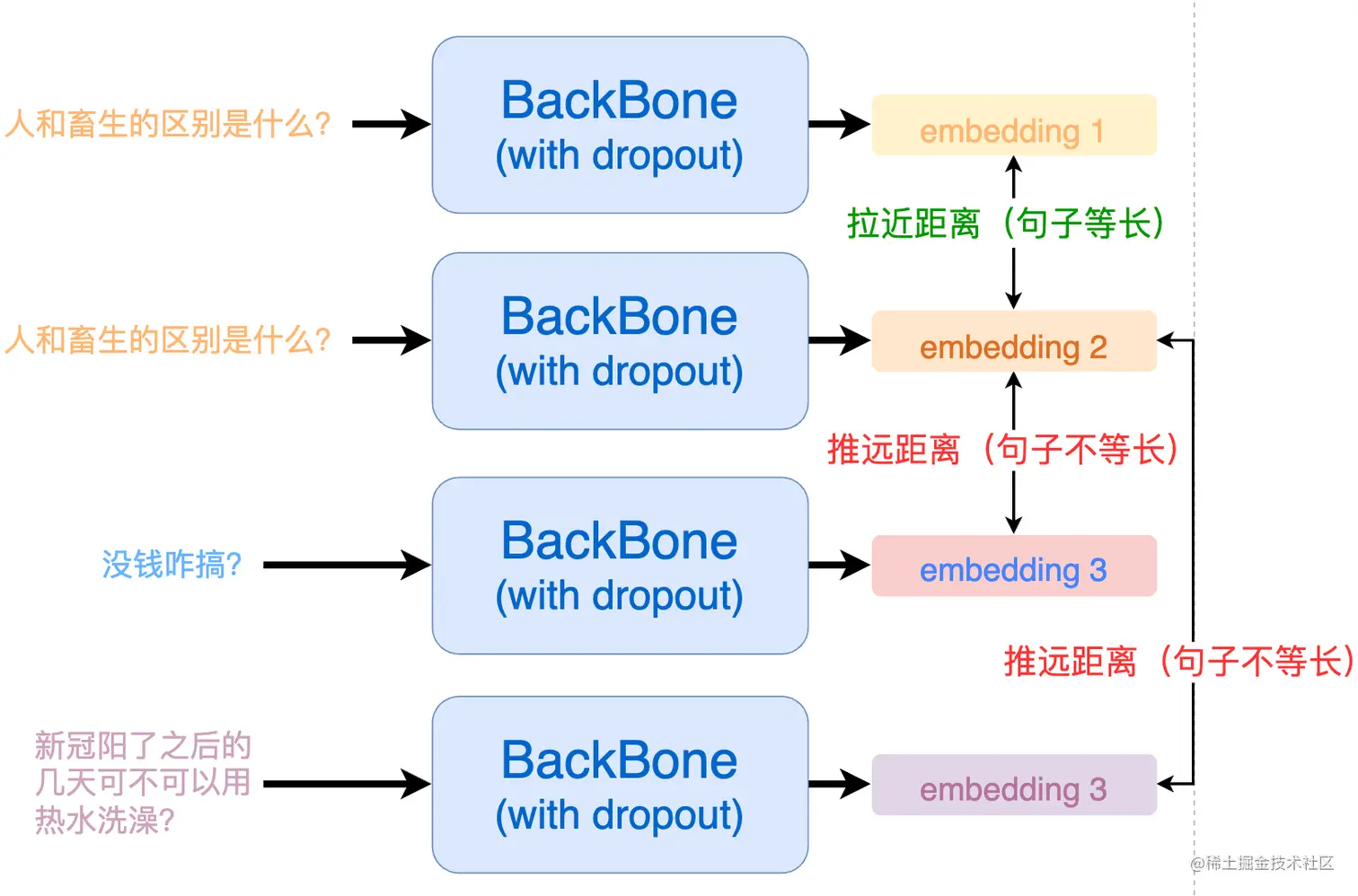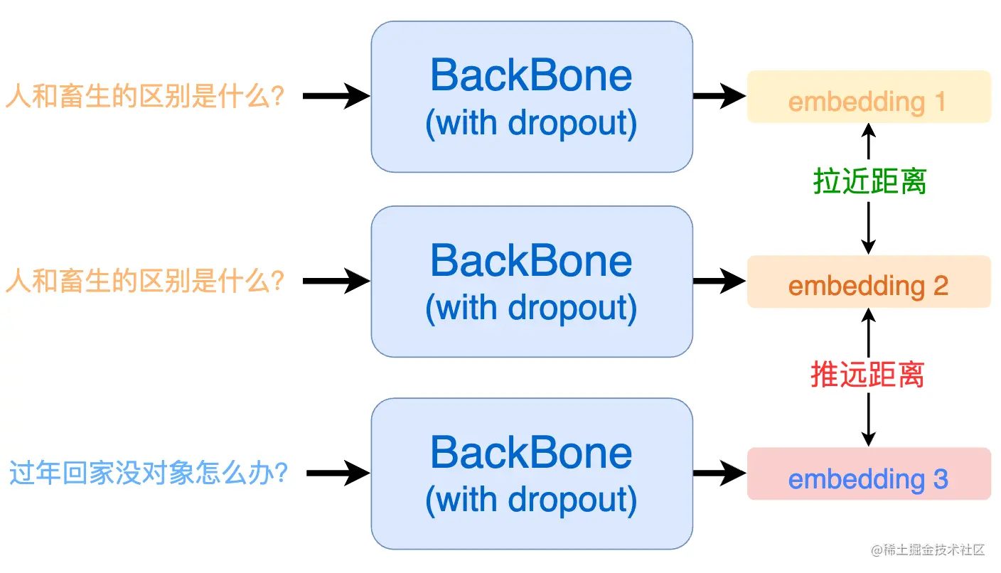 但现在问题是:我们没有标注数据,怎么知道哪些文本是相似的,哪些是不相似的呢?SimCSE 相出了一种很妙的办法,由于预训练模型在训练的时候通常都会使用 dropout 机制。这就意味着:即使是同一个样本过两次模型也会得到两个不同的 embedding。而因为同样的样本,那一定是相似的,模型输出的这两个 embedding 距离就应当尽可能的相近;反之,那些不同的输入样本过模型后得到的 embedding 就应当尽可能的被推远。