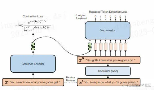 结合句子间差异的无监督句子嵌入对比学习方法——DiffCSE主要还是在SimCSE上进行优化(可见SimCSE的重要性),通过ELECTRA模型的生成伪造样本和RTD(Replaced Token Detection)任务,来学习原始句子与伪造句子之间的差异,以提高句向量表征模型的效果。