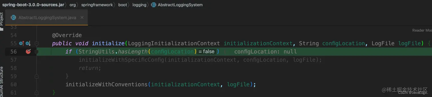 执行到AbstractLoggingSystem#initialize时,日志配置文件为null: