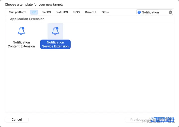然后在弹出的面板上选择 Notification Service Extension 选项,随后点击下一步,输入名字点击确定即可: