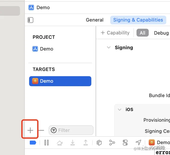 首先选择项目根目录,选中你的 Target,然后在 Signing & Capabilities 部分,点击 + Capability