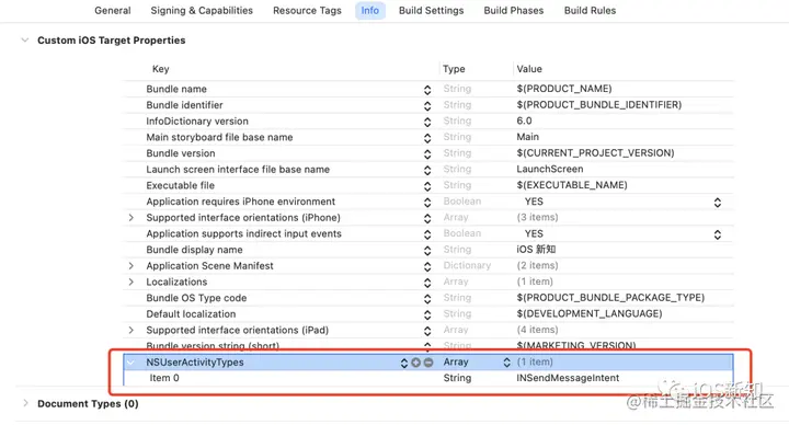 在实现通信通知之前,还需要在你的 info.plist 文件中新增一个 NSUserActivityTypes 的数组,里边添加一个 INSendMessageIntent