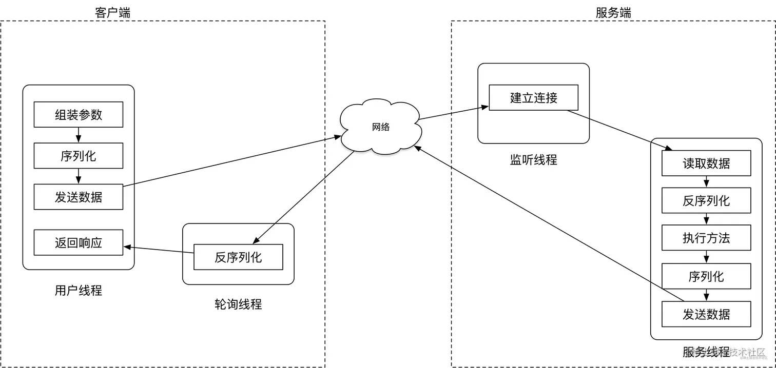 - transport 表示通讯,它负责具体的网络通讯,将按照protocol组装好的二进制数据通过网络发送出去,并根据protocol指定的方式从网络读取数据