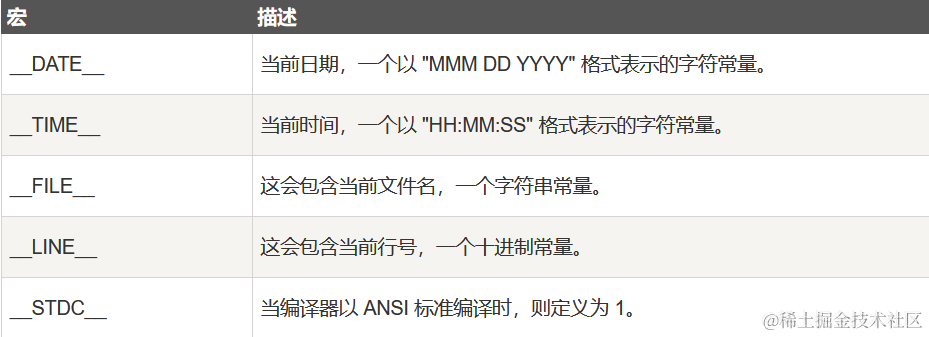 ANSI C 定义了许多宏。在编程中您可以使用这些宏,但是不能直接修改这些预定义的宏。