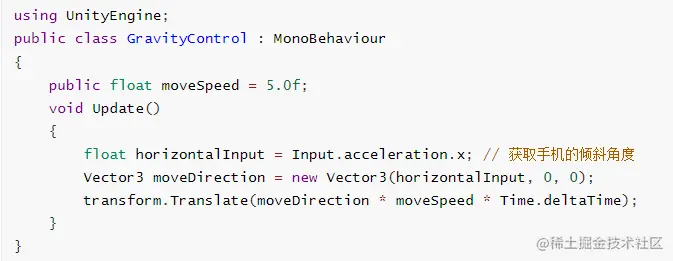 Unity是一款广泛使用的跨平台游戏引擎,支持在多种平台上开发游戏。在Unity中接入重力感应可以通过使用Input类来实现。下面是一个简单的示例代码,展示了如何在Unity中使用重力感应控制角色的左右移动:
