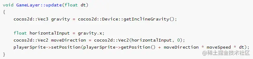 Cocos2d-x是一个开源的2D游戏引擎,适用于移动设备游戏的开发。在Cocos2d-x中,你可以使用加速度计来获取手机的倾斜角度,并用其来控制游戏角色的移动。以下是一个简单的示例代码,展示了如何在Cocos2d-x中使用重力感应控制角色的移动: