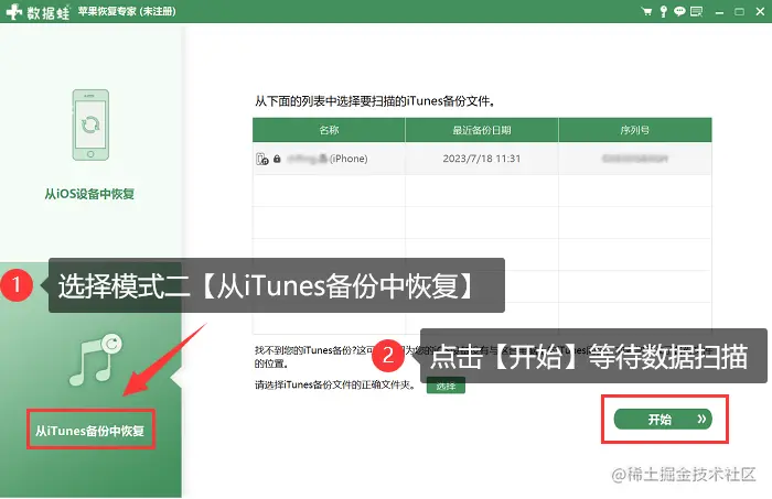第一步:重新选择【从iTunes备份中恢复】模式,然后点击【开始】等待数据扫描。