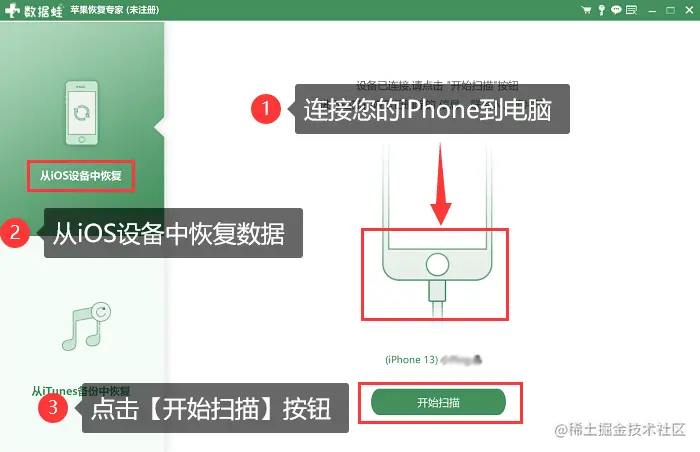 第二步:默认【从iOS设备中恢复】,同时连接您的手机和电脑,然后点击【开始扫描】。