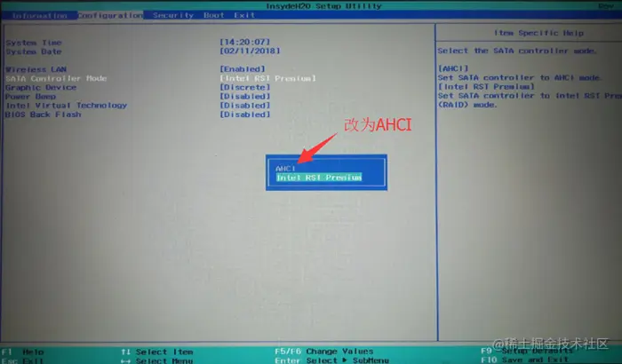 2、选择“configuration”,光标移动到“SATA Controller Mode”,改“Intel RST Premium”为“AHCI”;