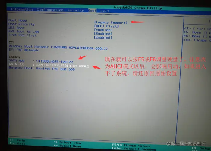 5、重启进入BIOS,就会看到相应的硬盘,光标移动到对应的硬盘,按F5或F6调整。
