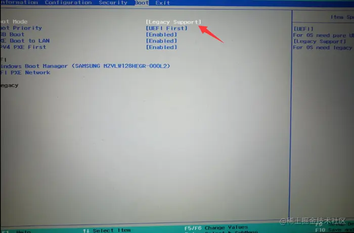 3、选BOOT选项,光标移动到“BOOT Mode”改“UEFI”为“Legacy support”。