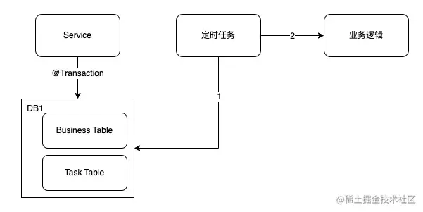 业务表和任务表在一个数据库中,由数据库的一个事务控制器实现事务。在应用中,另起一个定时任务,由定时任务去查询任务表,把任务表中新进的任务抓取后执行该定时任务需要执行的业务逻辑。