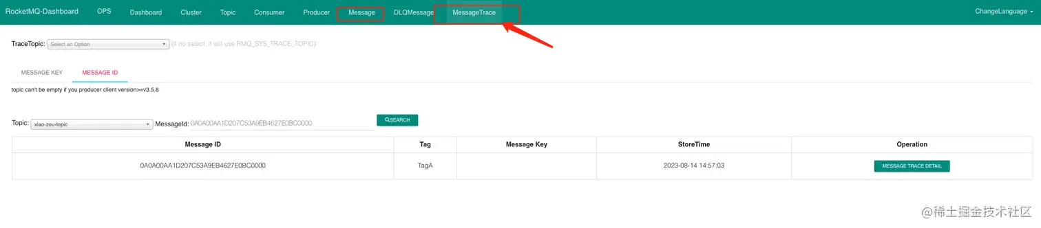 我们一般用的是消息的查询,现在我们直接去消息轨迹那里查看