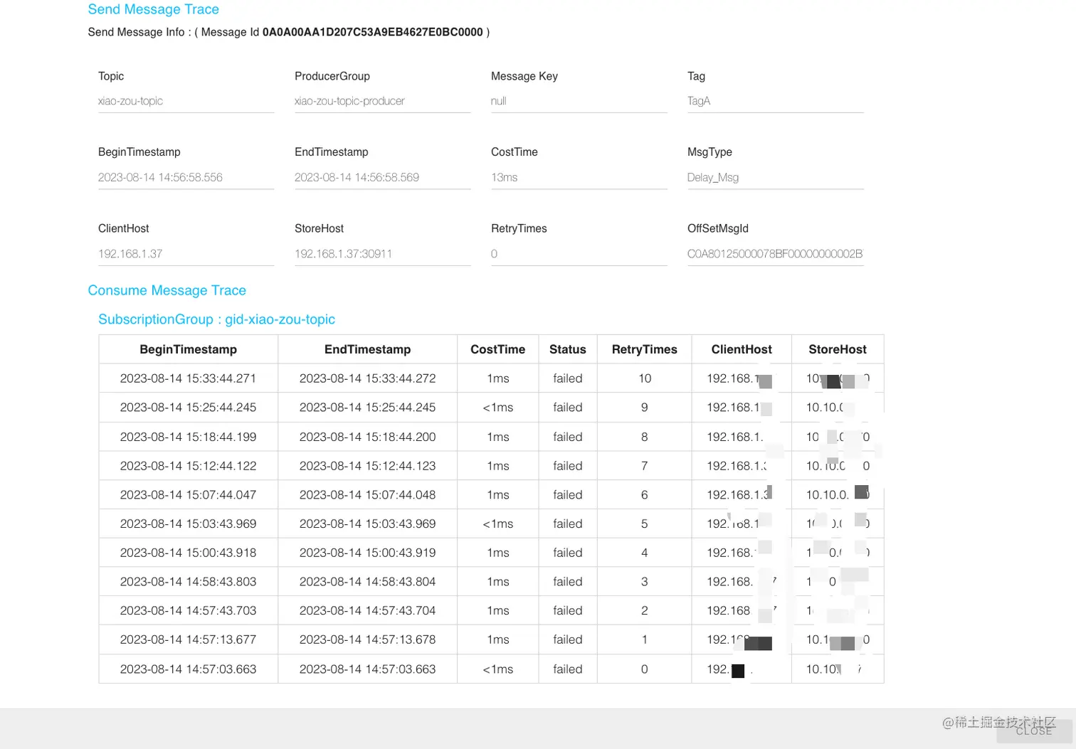 我们查看消息轨迹可以看到非常详细的消费记录 包括消息的