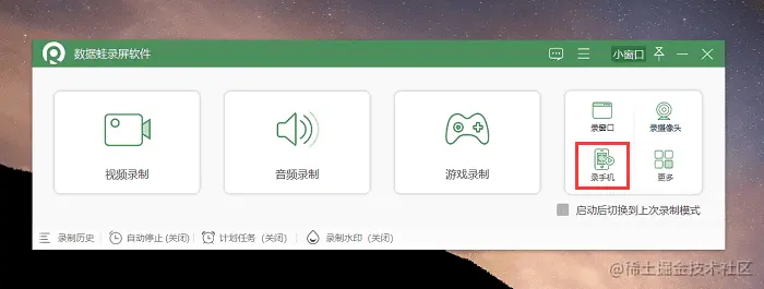 第1步:在浏览器中搜索“数据蛙录屏软件”进入官网下载安装它。打开数据蛙录屏软件,您将看到一个简洁的录屏界面,选择 “录手机” 功能。