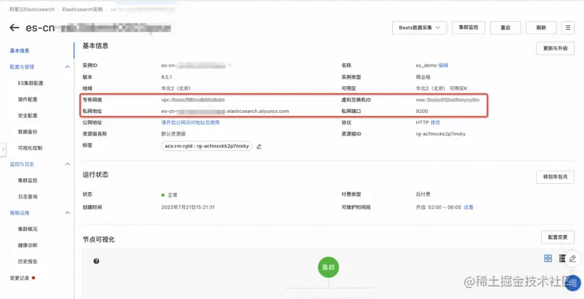 - 点击实例 ID 或 “管理”,进入实例详情页,可查看ES的实例所在的专有网络、私网地址、私网端口等信息;