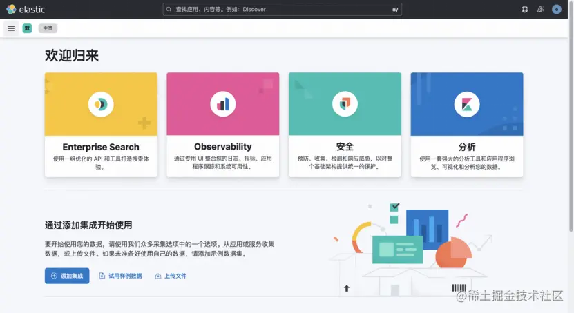 - 点击公网入口进入 Kibana,正确输入用户名密码后,即可登录。用户名默认为:elastic;密码为实例创建时输入的自定义密码。