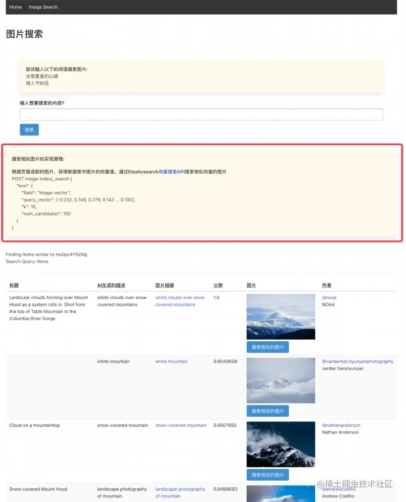 上面提到的图像嵌入对于图像相似性搜索的效果至关重要。它们应该存储在一个单独的索引中,该索引包含图像向量,在上面的代码中称为 your-image-index。