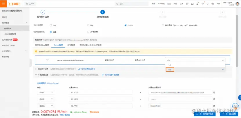 | 配置镜像 | 在配置镜像区域,单击Demo镜像页签,选择SAE提供的版本为nlp的镜像Demo。完整的镜像地址如下:registry-vpc.cn-beijing.aliyuncs.com/sae-serverless-demo/python-demo:nlp |