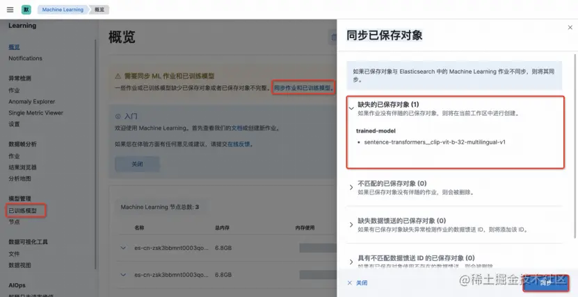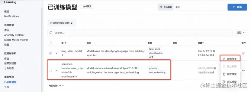 - 左侧菜单栏 “Analytics” 进入 “Machine Learning” 中 “同步模型” 后进入 “模型管理-已训练模型” 并部署